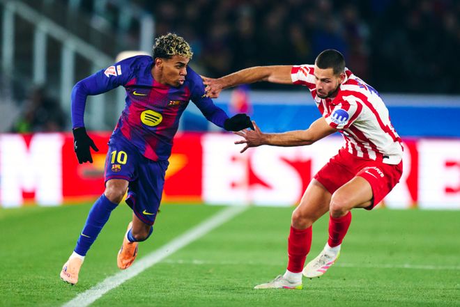 开场之后,亚马尔连续送出外脚背传球,试图搅乱马竞的防线。两队拼抢激烈,攻防转换的节奏相当快。