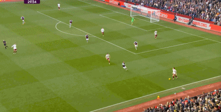 所以在第28分钟,阿斯顿维拉完成抢断之后,发动了左路的进攻,一脚传中打到禁区内,便来到了后点的卡什脚下: